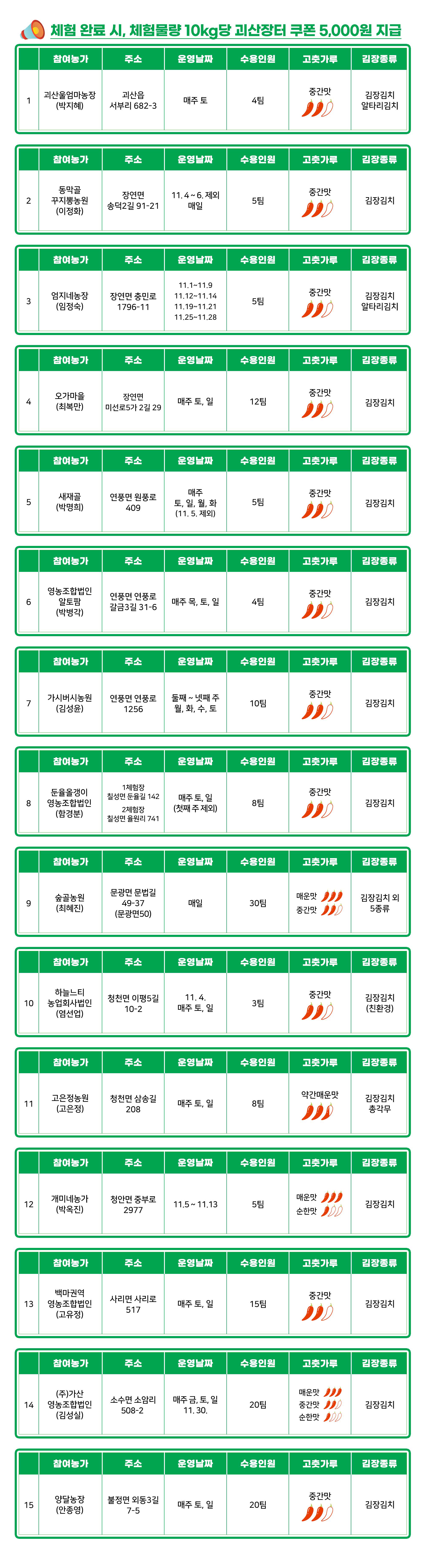 아래의 15개의 농가에서 일정과 비용을 고려하여 선택하여 장갑, 김치통, 앞치마 등을 준비하여 김장을 하면 됩니다. 체험을 완료하면 체험 물량 10kg 당 괴산장터 쿠폰 5000원이 지급된다고 합니다. 체험 참가비는 135,000원 또는 160,000원 정도입니다.