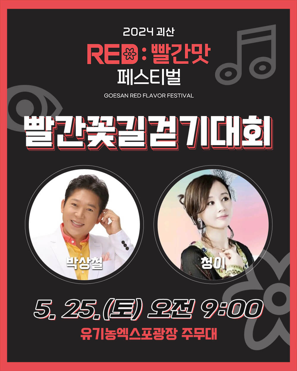 괴산의 대표 특산물인 '고추'의 빨강, 봄을 대표하는 꽃인 '양귀지, 백일홍, 튤립 등'의 빨강을 테마로 한 올해 처음으로 개최되는 지역축제입니다. 빨강이 상징하는 매운맛, 그리고 열정을 느낄 수 있는 다채로운 프로그램들을 즐길 수 있고 무엇보다 초대가수 라인업이 어마어마합니다. 제1회, 처음으로 개최되는 축제이니만큼 더욱 특별하고 재미있게 준비에 만전을 기하고 있다고 하니 이번 봄 나들이는 괴산으로 떠나보는 것이 어떨까요?