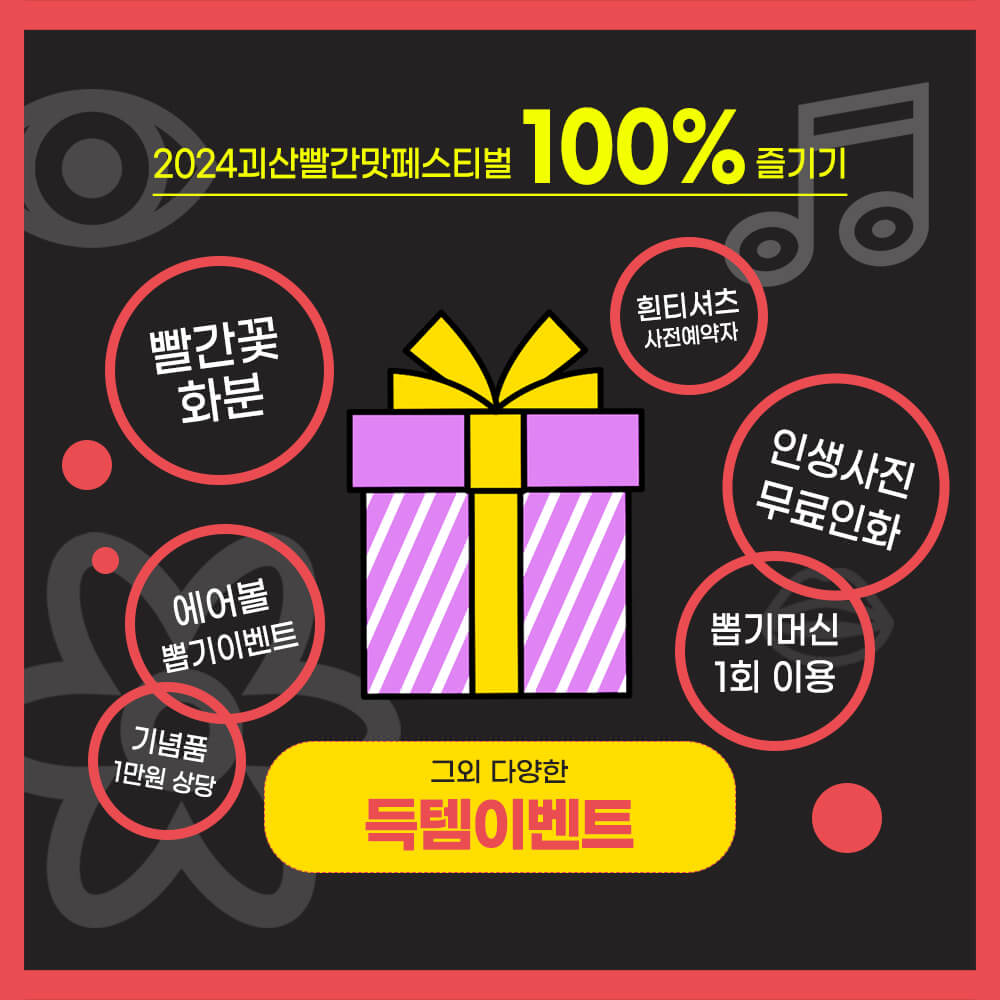 - 축제기간 중 괴산지역 내 1만 원 이상의 구매영수증 소지자를 대상으로 빨간꽃화분과 영수증 교환이벤트 단, 푸드트럭 영수증은 제외됩니다