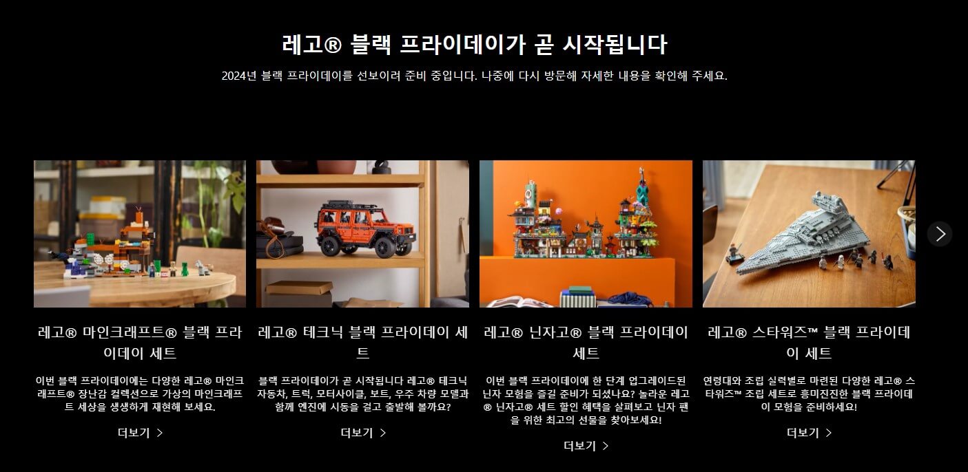 2024 레고 블랙프라이데이에는 다양한 레고® 마인크래프® 장난감 컬렉션, 레고 닌자고 세트, 레고 스타워즈 조립세트, 테크닉 자동차, 트럭, 모터사이클, 보트, 우주차량모델 등 인기 모델들을 더욱 특별하고 할인된 가격으로 구매할 수 있다고 합니다.