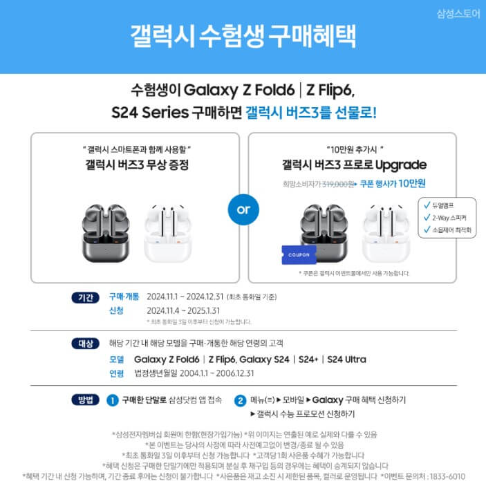 - 수능 특별 할인 쿠폰 3만 원 (대상모델: 갤럭시Z폴드, Z플립6, S24시리즈, 탭S10시리즈, 갤럭시북4시리즈 등)