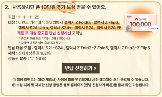 - 반납대상모델 : 갤럭시S21~S24, 갤럭시Z폴드3~Z폴드5, 갤럭시Z플립3~Z플립5