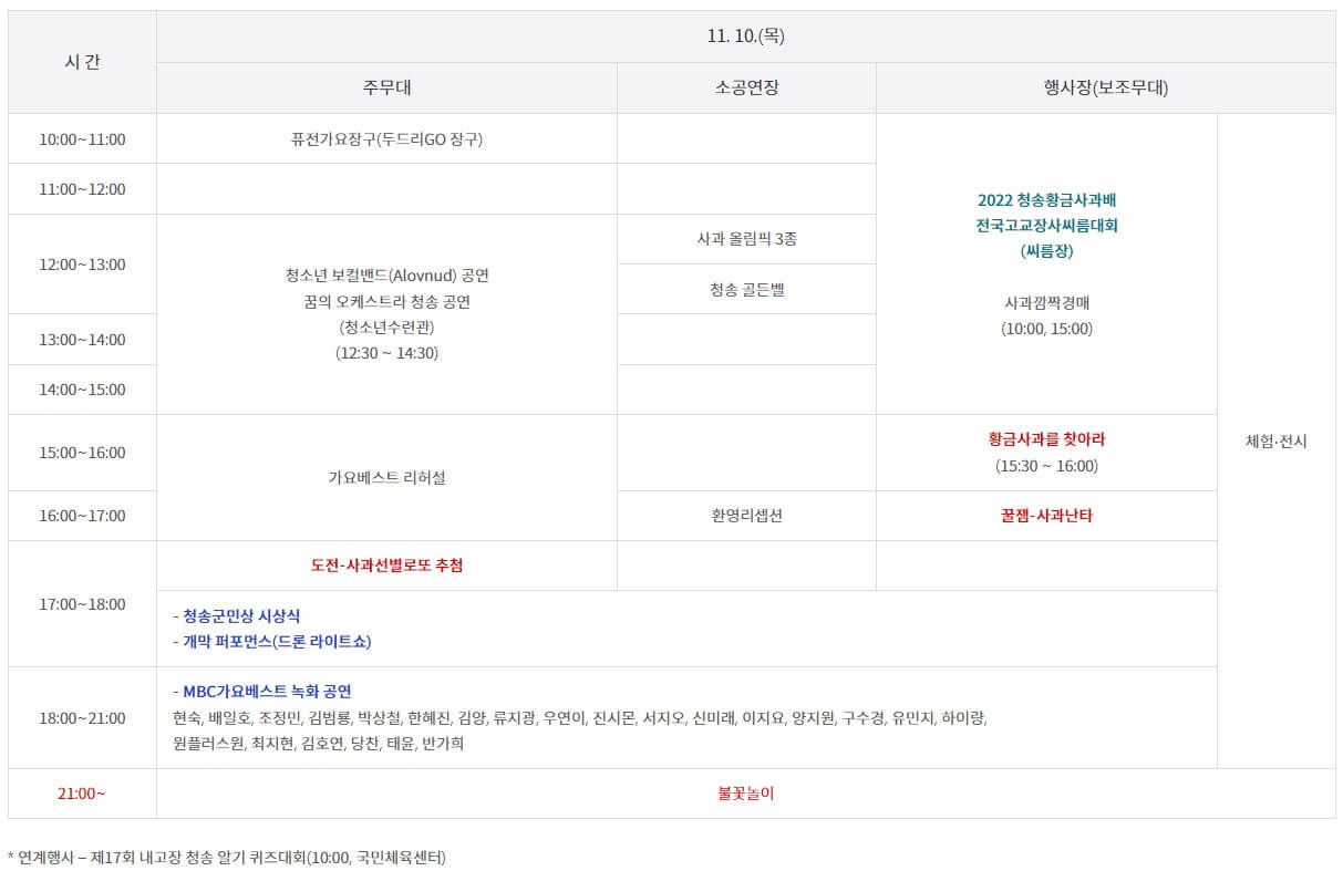 문화체육관광부 지정 대한민국 대표축제 제16회 청송사과축제가 11월 9일 개막합니다. MBC가요베스트 녹화와 함께, 이찬원 박서진, 홍진영, 소찬휘 등 인기가수들의 축하무대, 그리고 청송사과 퍼레이드, 청송꽃줄엮기 전국대회 등 다양한 프로그램을 즐기실 수 있습니다.