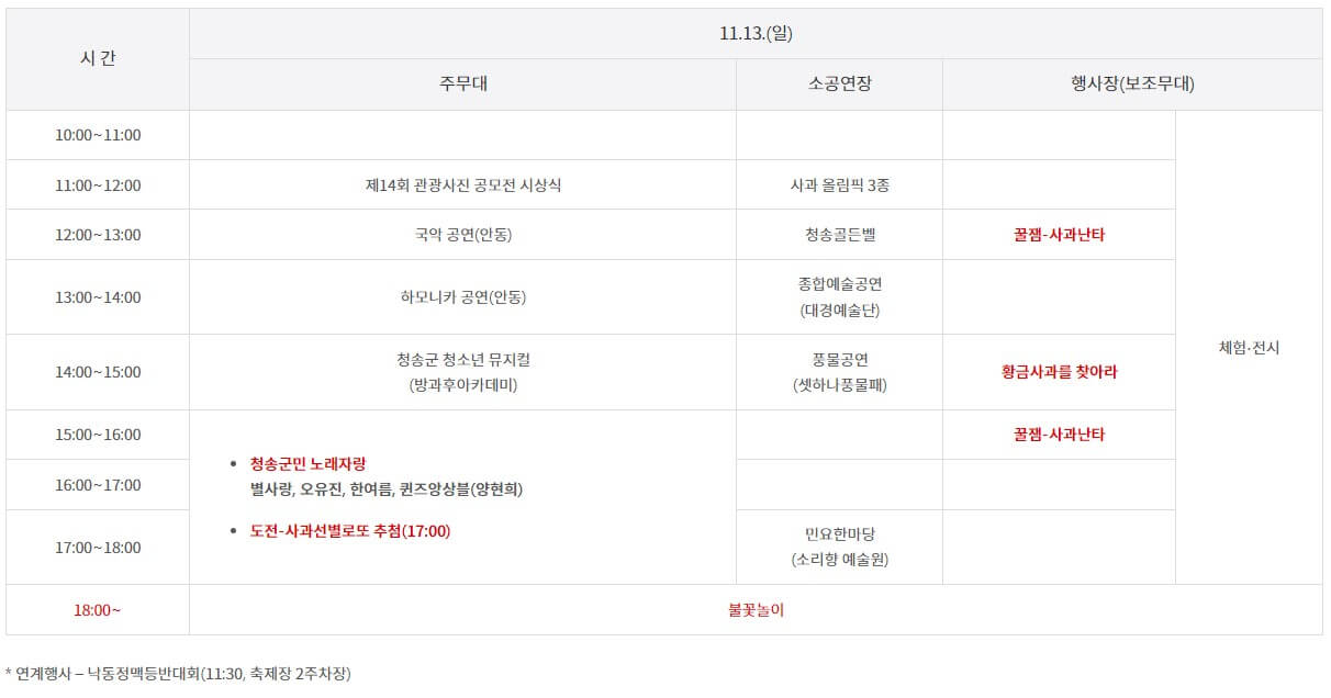 축제기간 내내 축하공연이 끝난 후, 불꽃놀이를 매일 즐기실 수 있으며, 청송사과 및 농특산물 판매행사를 통해 구매하실 수 있습니다. 온 가족이 함께 즐길 수 있는 다양한 프로그램이 마련되어 있으니 직접 방문하셔서 2022년 얼마 남지 않은 지역축제를 함께 즐기실 수 있었으면 좋겠습니다.