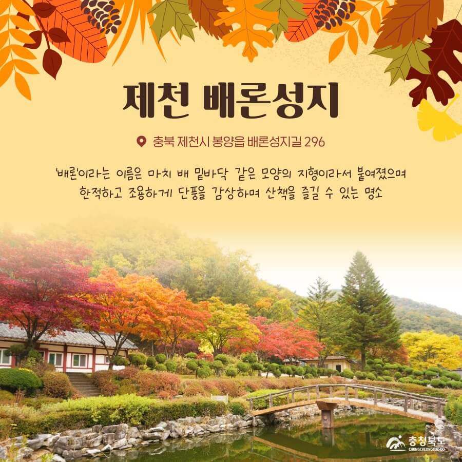 "배론성지는 박해에도 굴하지 않고 천주교 정신을 이어온 곳으로 천주교 역사의 중요한 부분을 차지하고 있는 신앙유산으로 가득한 곳입니다. 고요한 배론성지는 사방에 붉게 물든 단풍이 돋보이는 곳으로 평화롭고 안정된 마음으로 단풍으로 힐링할 수 있습니다. 특히 청명한 가을 하늘과 붉은 단풍을 담은 작은 연못은 배론성지 단풍의 클라이맥스입니다."