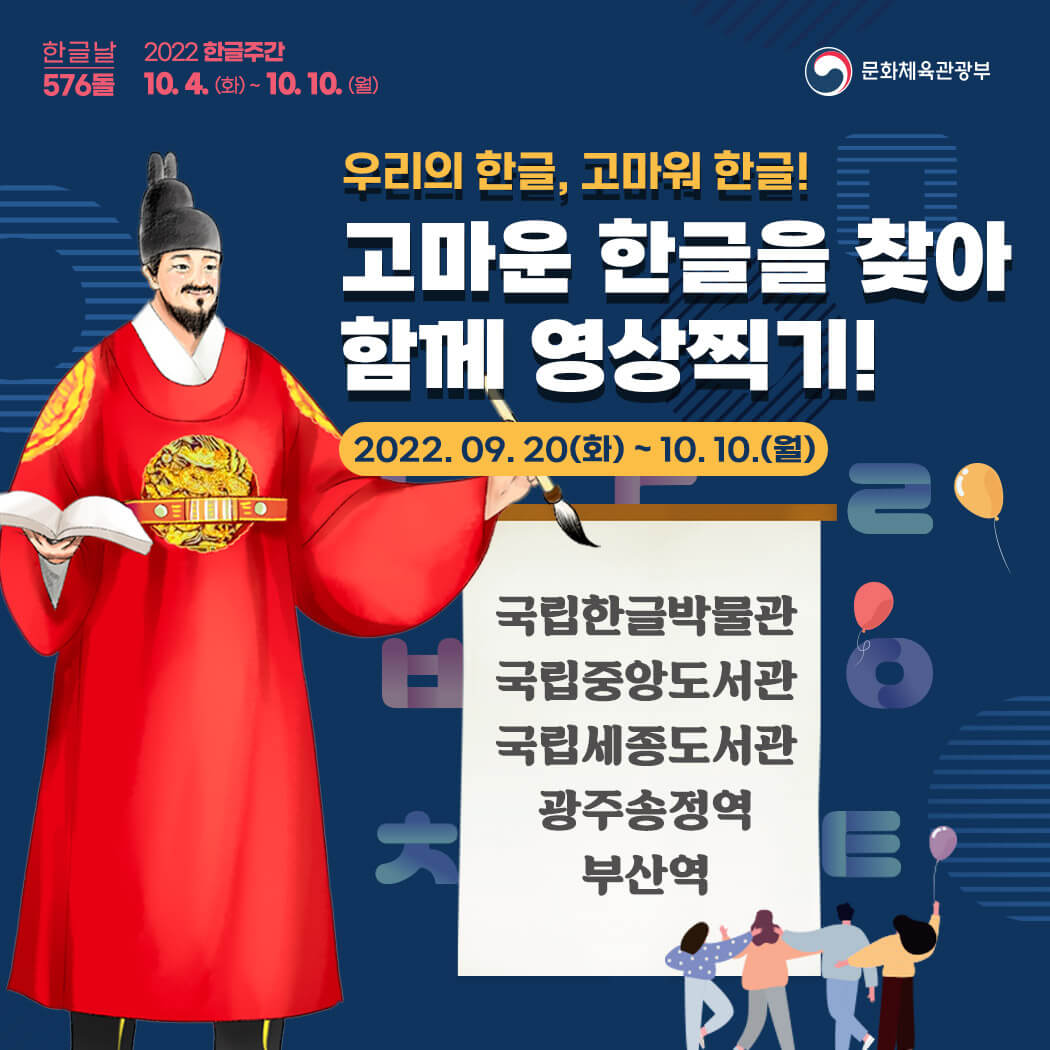 2022 한글주간은 10월 9일 한글날을 기념하고 세계인이 함께 참여하는 문화축제를 통해 한글의 가치를 되새기고자 문화체육관광부와 국립한글박물관이 지정한 기간입니다. 올해는 10월 4일부터 10일까지로 '고마워, 한글'을 주제로 국립한글박물관, 국립국어원, 세종국악당 등에서 다양한 공연, 전시, 체험 등 풍성한 행사가 마련되었습니다.