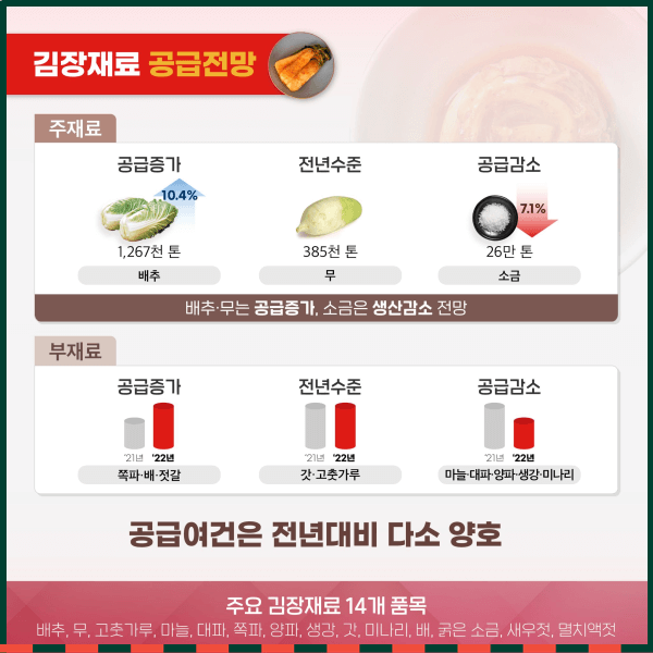 2022 김장시기에 맞춰 5주간 김장재료 수급안정을 위한 대대적인 할인 지원에 들어간다. 할인기간 동안 마트, 온라인몰, 전통시장, 로컬푸드 직매장 등에서 혜택을 누릴 수 있다.