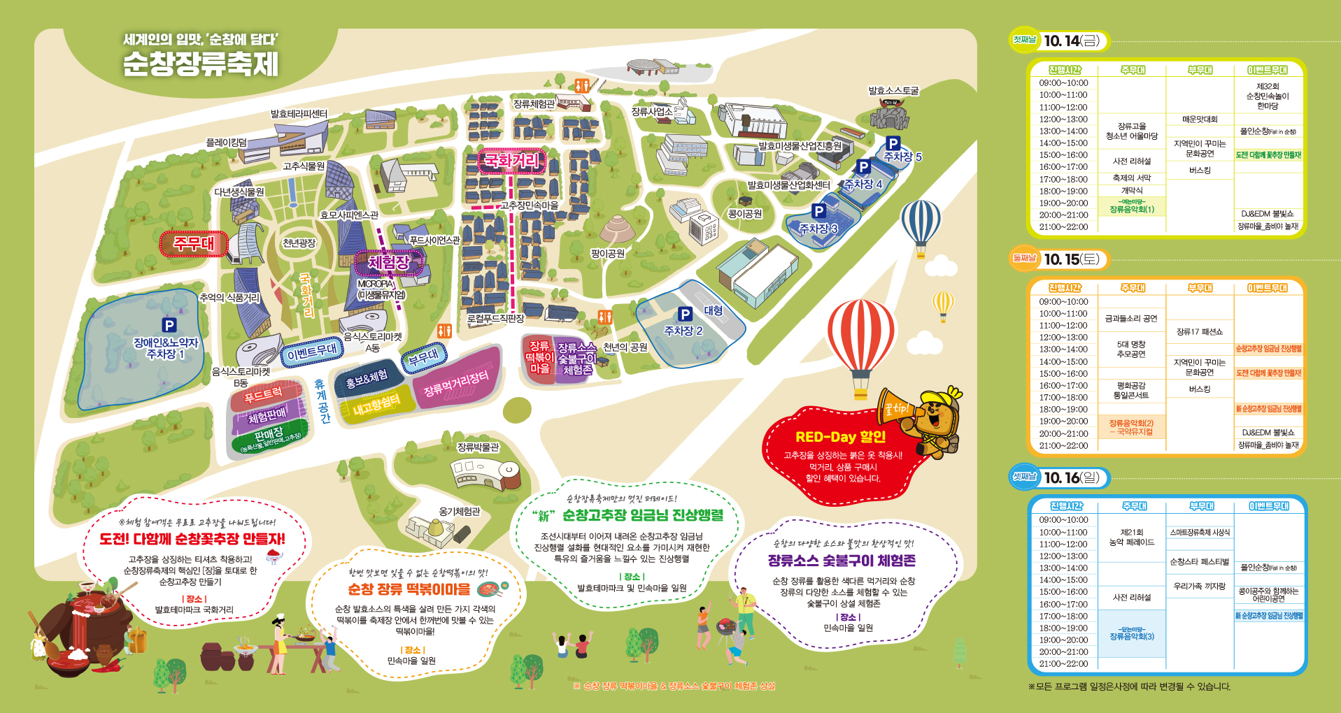 - 고추장을 상징하는 붉은 옷 착용 시 먹거리, 상품 구매 시 할인 혜택 제공