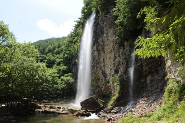 "순창 제1경 강천산 병풍바위에 조성된 높이 40m의 폭포"
