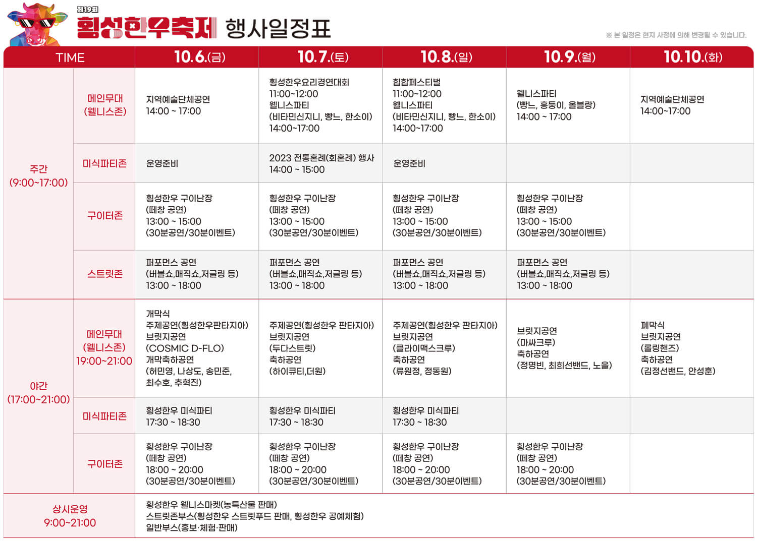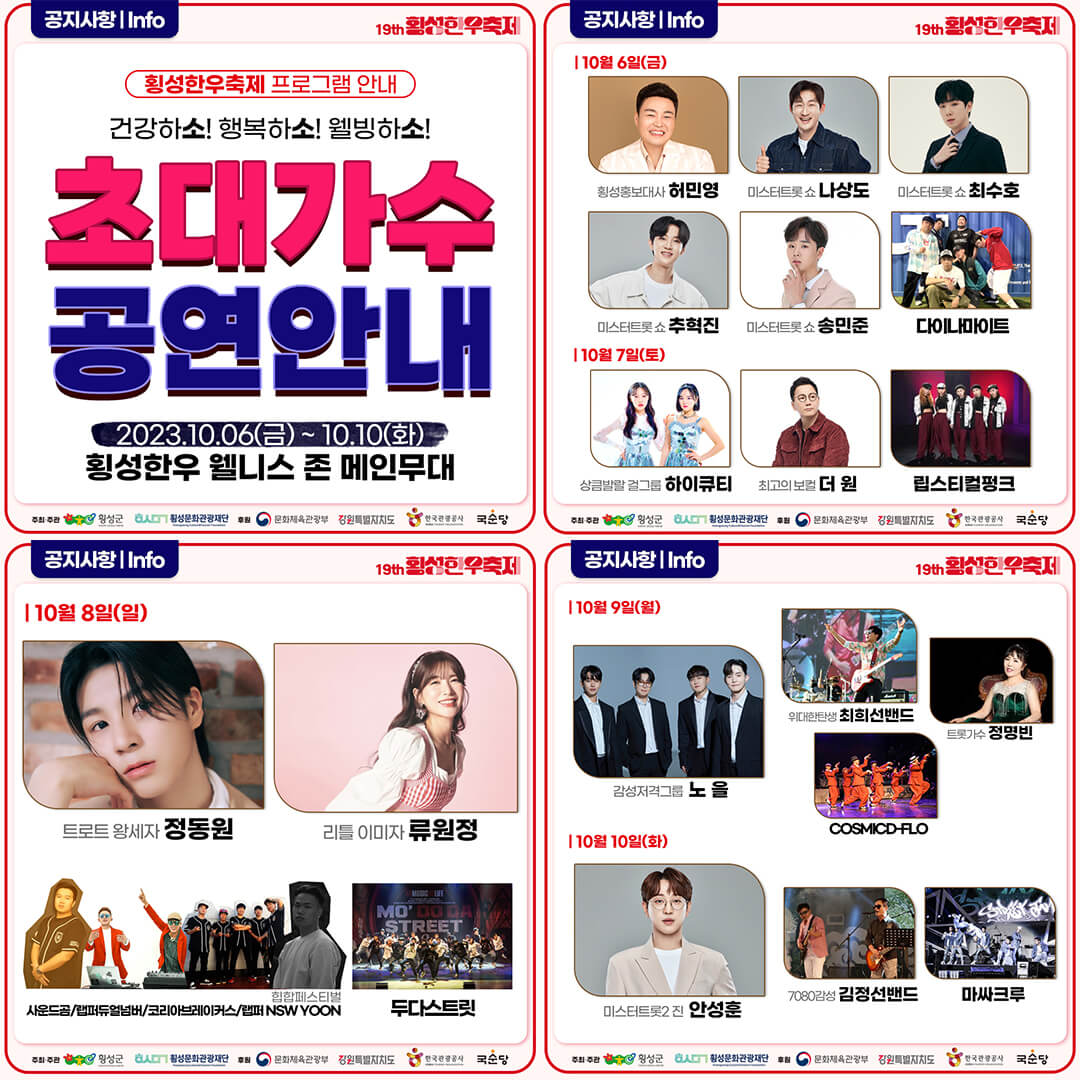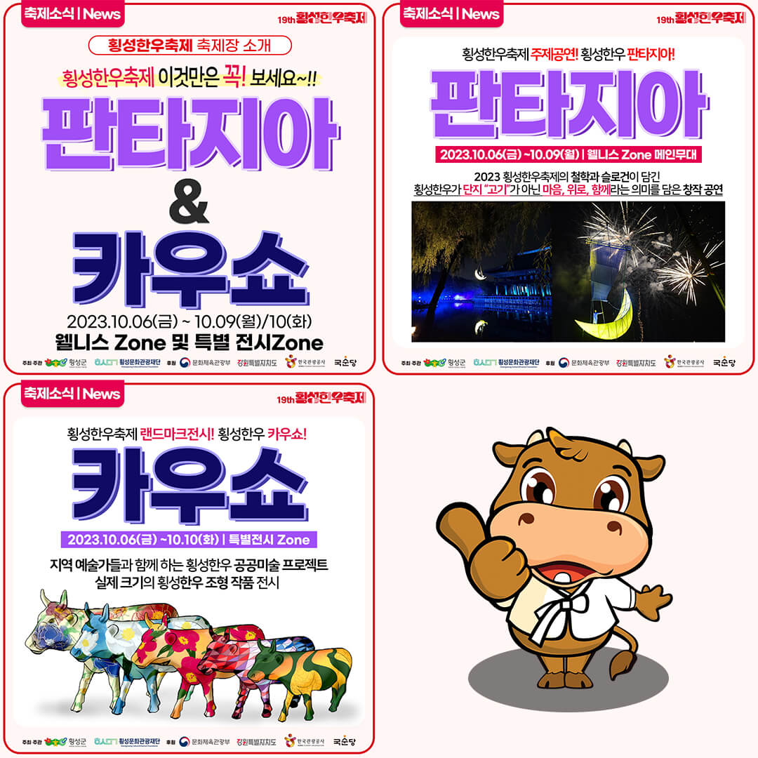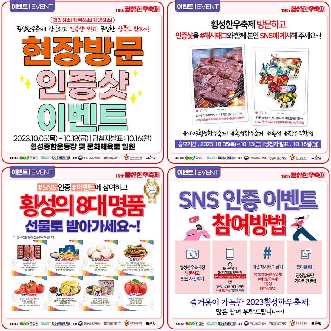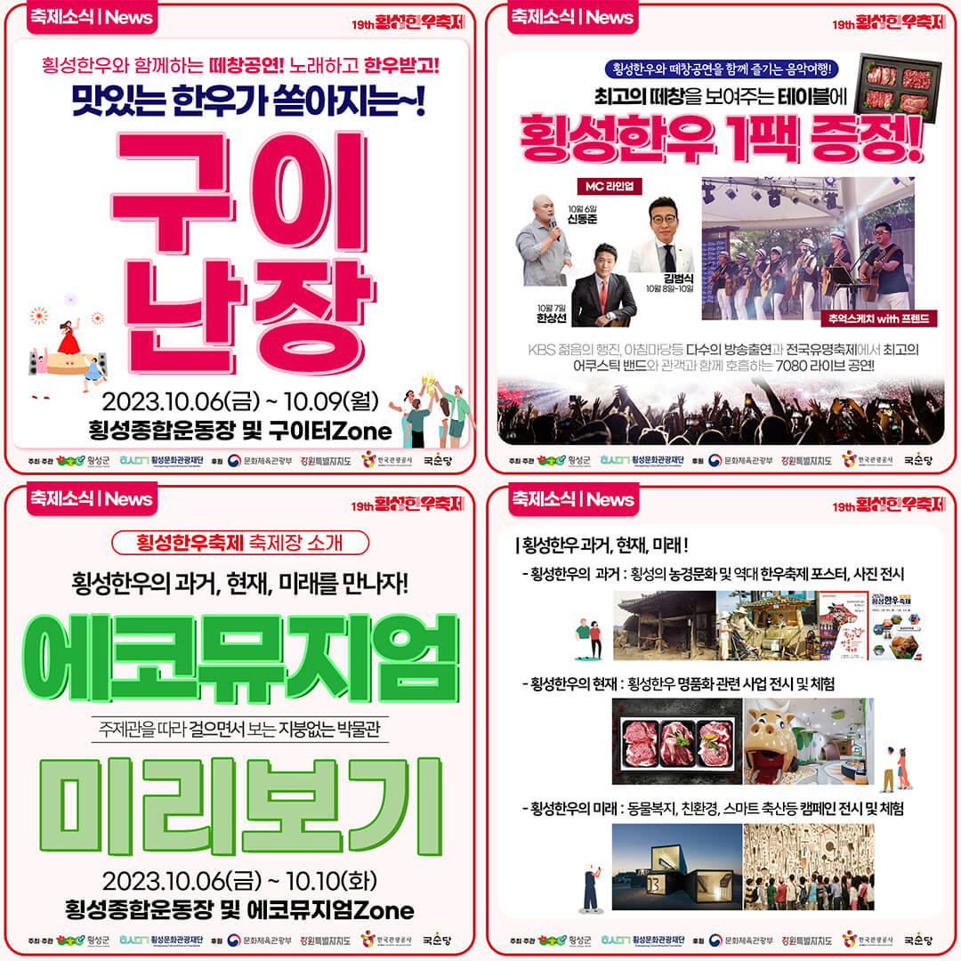 제19회 횡성한우축제에는 먹거리, 볼거리, 즐길거리를 제공하는 다양한 프로그램이 준비되어 있습니다. 직접 한우를 구워먹을 수 있는 한우구이터부터 초대가수 허민영, 나상도, 최수호, 추혁진, 정동원, 류원정, 노을, 안성훈 등의 화려한 축하공연 그리고 저렴한 가격에 한우를 구매할 수 있는 마켓도 운영이 됩니다.