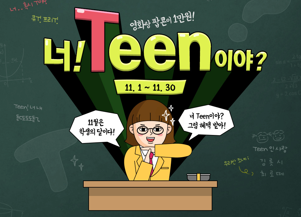 수능을 마친 수험생과 만 13~ 18세 회원을 대상으로 7,000원 상당의 영화 관람권과 팝콘 중간사이즈, 음료 중간 사이즈가 결합된 '틴 콤보'를 3,000원에 구매할 수 있는 쿠폰을 제공합니다.