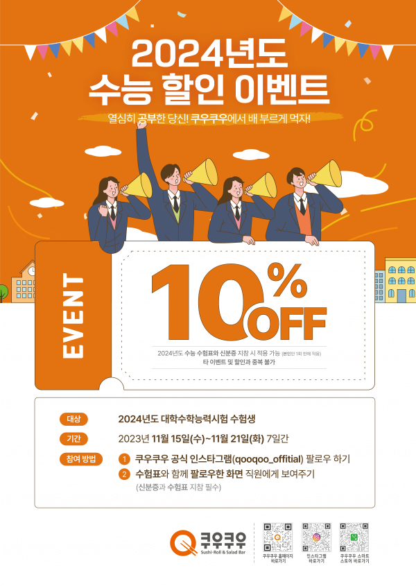 - 쿠우쿠우 공식 인스타그램 (qooqoo_official)팔로우 한 후 수험표와 함께 팔로우 한 화면 직원에게 보여주기