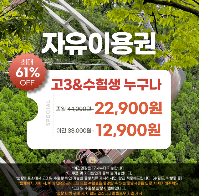 서울랜드는 수험생들에게 60%할인된 파크이용권을 제공합니다.