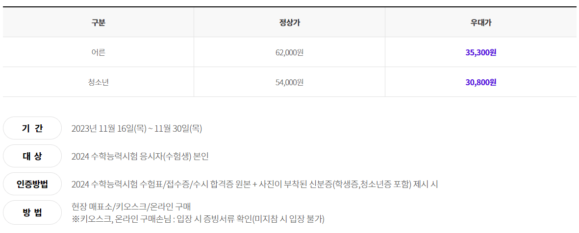 - 인증방법 : 매표소에서 수험생 본인의 수험표 제시, 수능 응시원서 접수증 원본 + 사진이 부착된 신분증