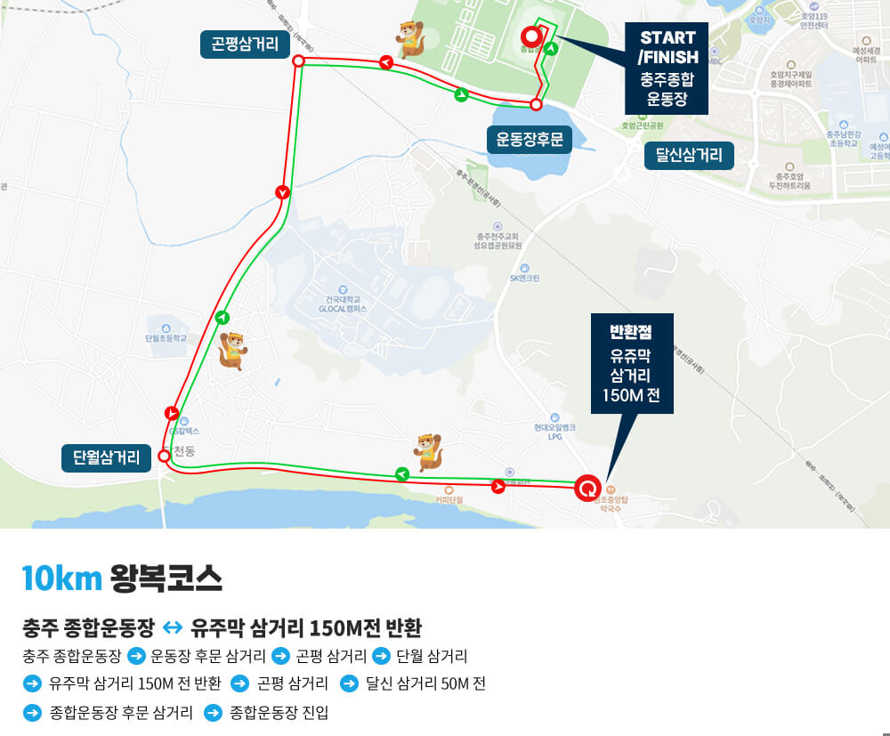 충주 종합운동장 → 운동장 후문 삼거리 → 곤평 삼거리 → 단월 삼거리 → 유주막 삼거리 150m 전 반환 → 곤평 삼거리 → 달신 삼거리 50m 전 → 종합운동장 후문 삼거리 → 종합운동장 진