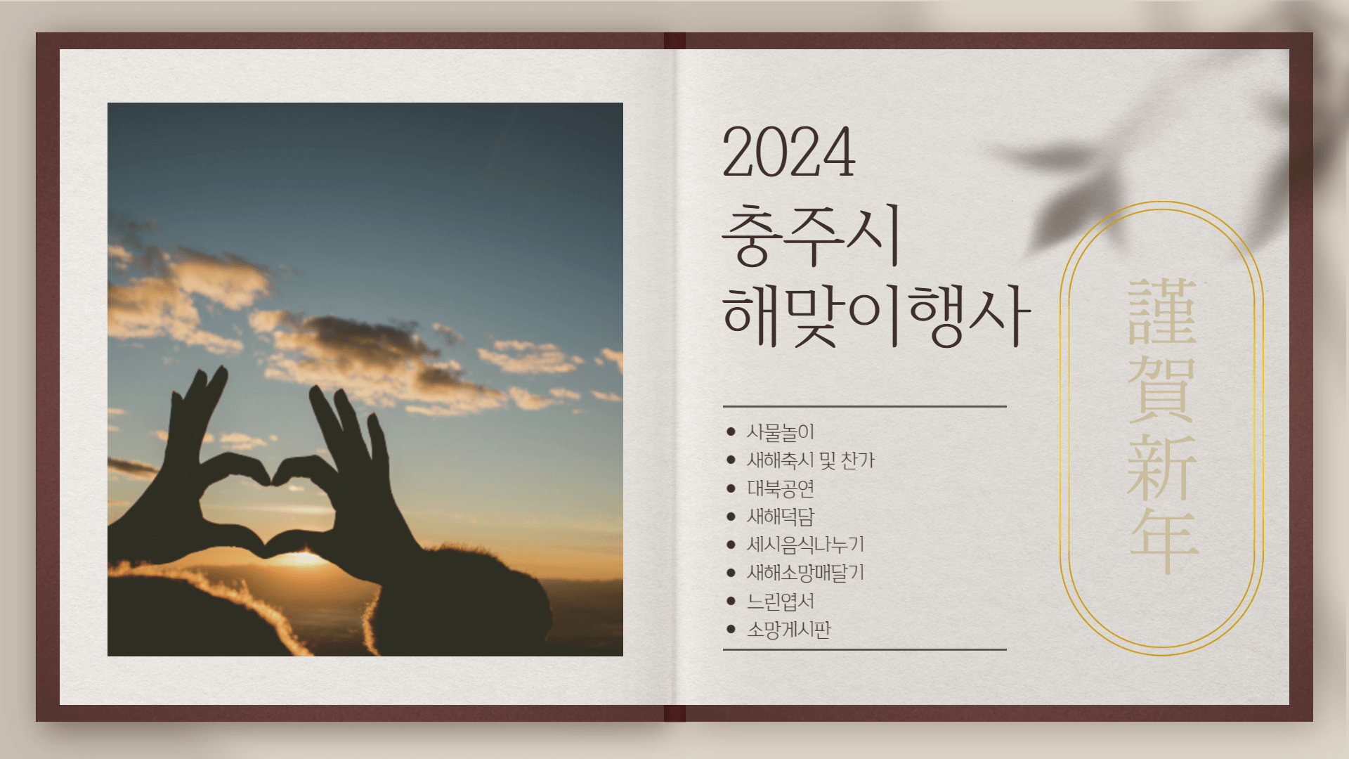 충주시에서는 2024년 갑진년 새해를 희망차게 맞이하기 위한 해맞이 행사를 개최합니다. 사물놀이, 대북공연, 세시음식나누기 등 다채로운 행사를 즐기실 수 있습니다.