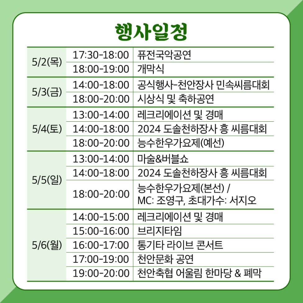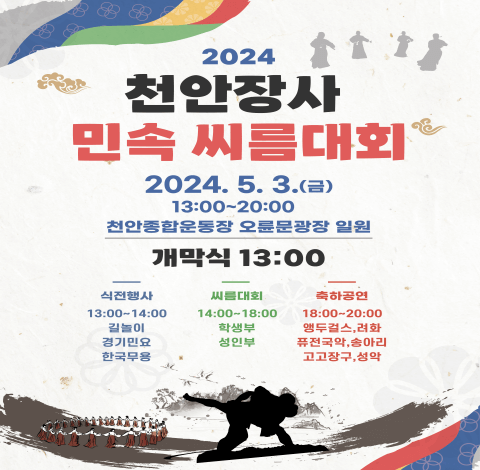 천안 능수한우축제의 공식행사인 천안장사 민속씨름대회가 3일 금요일 오후 1시에 시작됩니다. 식전행사로 길놀이, 경기민요, 한국무용을 감상하실 수 있고 씨름대회가 끝난 후에는 초대가수 앵두걸스, 려화, 퓨전국악 '하나연', 송아리, 고고장구, 성악 공연이 이어집니다.