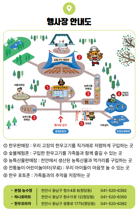 능수한우축제장은 천안의 한우고기를 직거래로 저렴하게 구매하실 수 있는 한우판매장과 구입한 한우고기를 숯불에 직접 구워서 먹을 수 있는 숯불 체험존, 천안의 농특산물과 먹거리를 판매하는 농특산물판매장, 아이들을 위한 전통놀이, 어린이 놀이터, 그리고 한우축제의 추억을 저장할 수 있는 한우 포토존 등이 운영이 됩니다.