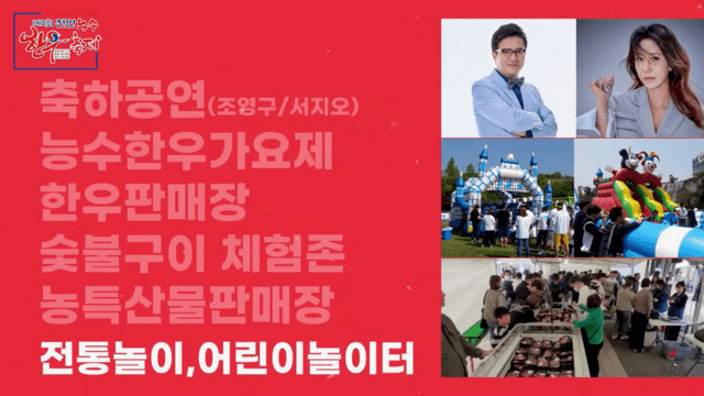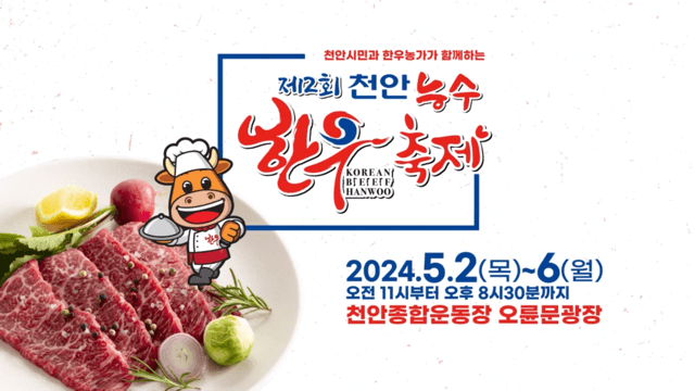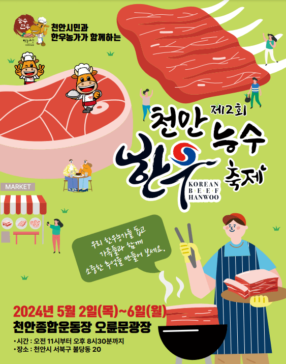 우리 한우 농가를 돕고 가족, 친구, 연인과 함께 푸짐하게 한우를 즐기며 즐거운 추억을 남길 수 있는 제2회 능수한우축제가 개최됩니다. 60개월령 이하 한우암소고기를 품목당 최대 36% 할인된 가격으로 구매하실 수 있으며 숯불구이터에서 직접 구워서 드실 수도 있습니다. 인기 가수들의 축하공연, 능수한우가요제, 천안장사 민속씨름대회 등 다양한 행사들도 즐기실 수 있으니 2024년 한우축제는 천안을 추천드립니다.
