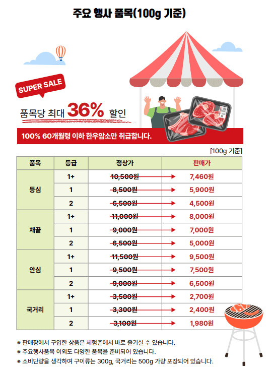 모든 가격은 100g 기준으로 60개월령 이하의 한우암소만을 판매합니다. 구입한 한우고기는 숯불체험존에서 직접 구워드실 수 있습니다. 품목당 최대 36% 할인된 가격으로 구입하실 수 있으니 꼼꼼히 확인하시어 알차게 구매하시기 바랍니다.