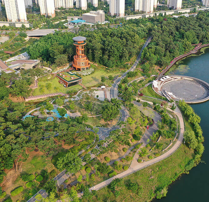 - 수변공간인 어반레비, 6개 테마의 둠벙, 9개 분수시설, 순환보행로, 가족캠핑장, 다목적 체험장, 야외공연장, 스포츠클라이밍장 등