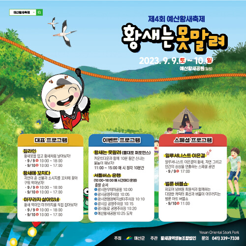사람과 황새가 공존하는 예산황새공원에서 농촌과 어우러지는 자연 공생 친환경 축제인 예산황새축제가 9월 9일 개막합니다. 황새의 먹이인 미꾸라지를 직접 잡아보는 체험과 짚라인 체험, 물대포 퍼포먼스, 벌룬 버블쇼와 함께 일루셔니스트 이은결의 황새와 자연, 인간의 상상력을 자극하는 스페셜 공연까지 다채로운 프로그램을 즐기실 수 있습니다.