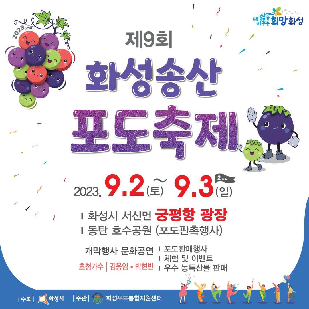 포도나무 재배에 최적인 온도와 해풍을 맞으며 자라 맛도 뛰어난 화성시의 지역축제 송산포도축제가 2일 개막합니다. 포도밟기, 포도따기 체험과 궁평리 어촌체험휴양마을에서 갯벌체험, 망둥어낚시 등 다양한 체험프로그램과 함께 김용임, 박현빈, 정하영, 한승기 밴드, 주병선, 고용주 등의 화려한 축하공연과 함께 마술쇼, 포도경매, 판매장 토크쇼, 문화예술공연 등 다양한 볼거리도 즐기실 수 있습니다.